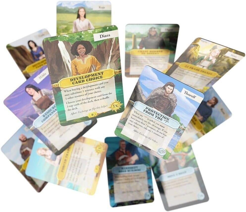Meet your new best friends on the island of Catan! These 12 helpful new characters generously share their skills and expertise to help you develop your fledgling communities into thriving cities. Whether it's protection from rolling a 7, moving a road, or chasing away the robber, The Helpers are always ready to lend a hand. This reboot of The Helpers of Catan features the same player powers with all-new characters plus two new abilities, beautifully illustrated with fresh and vibrant new art. Note: Requires CATAN to play
